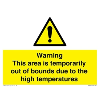 W001 : General Warning This sign is made from vinyl / sticker Air Release vinyl makes it easy to stick to flat, clean surfaces without bubbles. Not for rough, plastic or dusty surfaces. A5 landscape Sign Text: Warning This area is temporarily out of bounds due to the high temperatures