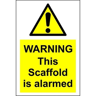 Warning this scaffold is alarmed sign 3mm Aluminium sign 600mm x 400mm Digitally printed and laminated for extra durability 10mm Radius rounded corners, no sharp edges