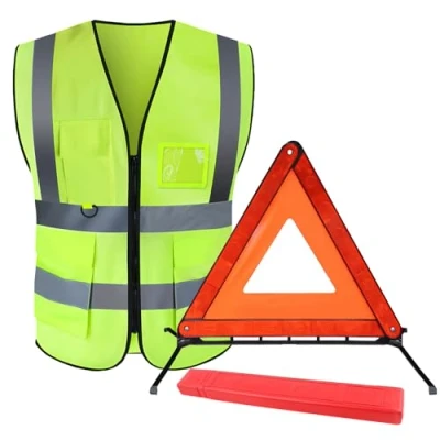 Premium Safety Reflective Vest: The fluorescent vest is crafted from high-visibility fluorescent fabric with 360° high-brightness reflective strips, ensuring optimal visibility from all angles in poor light conditions and providing enhanced personal protection. It is waterproof, durable, and suitable for long-term use. Robust Folding Warning Triangle: The premium triangle warning sign is constructed from highly reflective, durable plastic with a stable, foldable base. It remains securely upright while delivering clear warnings in all conditions—day or night, rain, fog, or snow. High-Reflectivity & High-Visibility: The warning vest and reflective triangle strictly comply with European EC/ECE safety standards, providing maximum visibility whether in direct sunlight or vehicle headlights to effectively alert other drivers and enhance overall road safety. Wide Applicability: The emergency European car travel kit serves as essential safety equipment for cars, lorries, and construction vehicles, providing reliable protection during road travel, worksite operations, or vehicle breakdowns. Package Contents: The package includes one warning triangle and one hi-vis yellow jacket. The breakdown triangle can be quickly folded and unfolded in seconds without tools, offering exceptional ease of operation.
