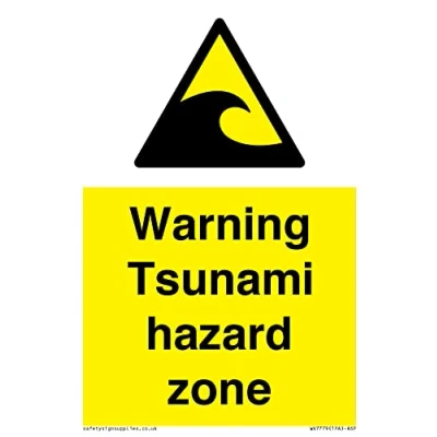 W056 : Tsunami hazard zone This sign is made from vinyl / sticker Air Release vinyl makes it easy to stick to flat, clean surfaces without bubbles. Not for rough, plastic or dusty surfaces. A6 portrait Sign Text: Warning Tsunami hazard zone