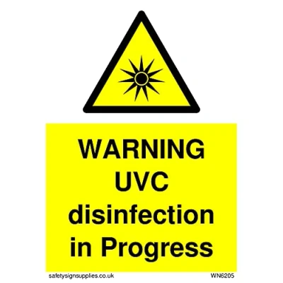 W027 : Optical radiation This sign is made from vinyl high tack A stickier sticker. Uses a stronger adhesive to make it more suitable for plastic surfaces like Wheelie Bins or where the sticker might get rubbed. A7 portrait Sign Text: WARNING UVC dinfection in progress