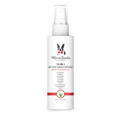 Warren London 10-in-1 After Bath Spray - 120ml Warren London have profesionally formualted this luxuorious after bath spray, suitable for all coat types and will showcase 10 amazing benefits. Conditions, Softens, Revitalises, Prevents Itch, Prevents Flake, Detangles, Shines, Luxuorious cent, Aromatherapy & Cleans Deters Itching and Flaking - A natural dog skin soother, our after bath spray helps deter itch and ease flaky dog dry skin. And great news! You can use this dog itch spray safely, even when your pooch is using topical flea and tick treatments. Our detangling spray for dogs is paraben-and-soap-free, so it’s safe for your fur baby. Directions for use - For best results, use product directly after bathing your dog. Spray an even amount of Warren London 10-in-1 After Bath Spray onto the dog’s coat. Although not critical, brushing the coat after spraying will help to even out the product and allow it to reach all parts of the coats. Let product dry into coat and do not wash off. Naturally Simple Ingredients - Infused with Aloe Vera, silk amino acids, and green tea leaf extract for healthy skin & coat. Proudly made in the USA.