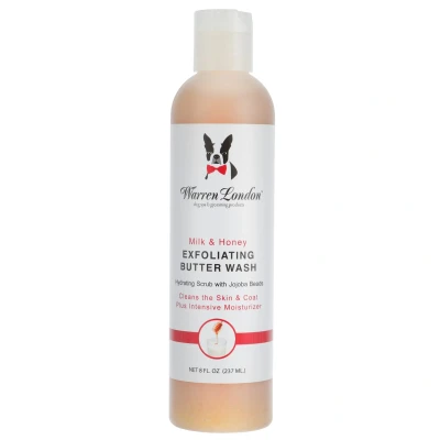 Warren London Exfoliating Butter Wash Milk & Honey 236ml The Warren London Exfoliating Butter Wash is the perfect mix to clean, exfoliate and hydrate all in one! This all natural product was created with Jojoba beads, which help to exfoliate the skin and coat. Contains added botanical extracts which help to moisturize the coat. This product can be used as much as needed to make sure your dog’s coat looks and feels great! Works well on all coat types. Excellent results on dry and damaged skin and paws. Leaves the coat soft,shiny and smooth with a delightful scent. Simply massage into a wet coat, allow the butter to rest on the skin for a few minutes then rinse. Repeat if necessary.