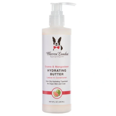 Warren London Hydrating Butter G & M 240ml Hydrating Butter from Warren London is a leave-in conditioner that is a non-oily intense hydrating treatment for silky smooth skin and coat. The extract used is a natural humectants that moisturizes and adds vital nutrients with a soothing scent. This is the only patented formula that releases moisturizing emollients every 2 hours for a 24 hour hydration. Hydrating Butter Works on all kinds of dogs coats Excellent results on dry and damaged skin, coats and paws Leaves your dogs coat looking shiny and smooth Coat will also smell great with a aroma-therapeutic scents To Use: Put a small amount onto your hands and rub thoroughly into your dogs skin and coat. Brushing the coat after will help to evenly spread the product throughout. This is a leave-in conditioner,so you do not have to rinse off. Ingredients: Guava & Mangostein - guava extract, garcina mangostana, water, isopropyl palimatate, cyclopentasiloxne, dimethicone, sodium polycrylate,C12-15, alkyl benzoate, glycerin, fragrance DMDM, hydantoin, iodopropynyl,mangostana peel extract, butylcarbamate, titanium dioxide, propylene glycol,yellow 10, red 40