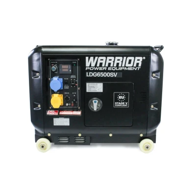 Unleash the Power of Warrior-Grade Performance Delivering strength, safety, and efficiency for your appliances and gadgets, this diesel-powered generator stands up to the toughest demands. WARRIOR QUALITY – Equipped with a robust diesel-powered 474cc engine for long-lasting performance WATTAGE – 6.25 kVA generator producing 5500 maximum watts and 5000 running watts to meet your power needs RUNNING TIME – The 16-litre tank ensures up to 12 hours of continuous operation at 50% load SMART + SAFE – Features a low oil shut-off sensor and an Automatic Voltage Regulator (AVR) control system for safe and efficient operation PEACE + QUIET – Operates at just 68 dBA from 7 meters and is enclosed in a soundproof canopy for ultra-quiet performance MULTIPLE OUTLETS – Includes 1 x 120V 32-amp outlet and 1 x 240V 32-amp outlet for versatile connectivity ▼ Warrior 6.25 kVa Diesel Generator Features You can trust in Warrior. Delivering high power at a low price, the Warrior 6.25 kVa diesel-powered 474cc engine generator is a perfect example of their high quality. Delivering long-lasting power to see you through anything from Caravan adventures to power cuts to industrial work – enjoy up to 12 hours of run time at 50% load thanks to the 16-litre fuel tank. With the brushed copper alternator producing a steady motor speed, this is power you can rely on. Packed with smart features, this Warrior generator is designed for low-maintenance power and safe running. Including a low oil shut-off sensor and an Automatic Voltage Regulator (AVR) control system, it's protected against dangerous voltage fluctuations or surges to protect you and your electronics. Enjoy all these features in peace and quiet that won’t draw too much attention. With a dBA level of only 68, this quiet-running generator features a soundproof canopy and an easily transportable heavy-duty frame, making it ideal for use on campsites without disruption. Please Note: Dual voltage generators will only give approx. 50-60% of the rated output on the lower voltage. The following documents are available for download: User manual ▼ Warrior 6.25 kVa Diesel Generator Specifications Fuel 6.25 Starting Watts 0 Max Watts 5500 Rated Watts 5000 Fuel diesel Noise Level @ 7m (dBA) 68 AC Load 1 x 120V 32amp, 1 x 240V 32amp AC Load Yes Socket Rating 32 / 32 Start Type Electric Engine CC 474.0 Engine HP 5.8 Phase Single RPM 3000 Power Factor 1.0 Fuel Capacity (L) 16.0 Oil Tank (ml) 1100 Operation at 25% load (hrs) >12 Choke Type Automatic Low Oil Shutoff Automatic Electric Start Yes Overload Protection Yes AVR (Automatic Voltage Regulator) Yes Fuel Gauge Yes Intelligauge Yes Voltmeter Yes Wheels Included Warranty (Years) 2 Certification EU Stage V, GS, ISO9001-2000, TUV, UKCA Weight (kg) 168.0 Dimensions mm (HxLxW) 730 x 880 x 590 Package dimensions 750 x 920 x 590 Part number / SKU LDG6500SV EU5 ▼ Warrior 6.25 kVa Diesel Generator What's in the Box Warrior 6.25 kVa Diesel Generator Operating manual ▼ Warrior 6.25 kVa Diesel Generator Wattage Guidance HOME RUNNING STARTING Microwave 1000 0 Coffee Maker 1500 0 Lamp 100 0 LED/LCD TV 150 0 Laptop 800 0 Modem/Router 20 0 RECREATION RUNNING STARTING Slow Cooker 200 200 Blender 300 650 Fan 200 0 LED/LCD TV 150 0 Radio 100 0 Game Consol 1500 0 ON THE JOB RUNNING STARTING Drill 600 900 Air Compressor 1600 4500 Circular Saw 1200 2000 Hand Sander 600 1200 Work Light 1000 0 Paint Sprayer 600 600 OUTDOORS RUNNING STARTING Lawn Mower 1200 2400 String Trimmer 350 875 Hedge Trimmer 450 1200 Edger 950 2400 Chainsaw 1200 2400 Pressure Washer 1200 2400 EMERGENCY RUNNING STARTING Refridgerator 700 2200 Sump Pump 1/2 hp 800 1300 Well Pump 1/2 hp 1000 2100 Furnace 1/4 hp 600 1000 Water Heater 4000 0 Window AC 1800 2800 How to calculate: RUNNING WATTS NEEDED Total running watts of ALL items to be powered by the generator at the SAME TIME. STARTING WATTS NEEDED Add highest SINGLE starting Watt to the total RUNNING WATTS needed above. *This chart is for reference only. Check your device for ACTUAL wattage requirements.