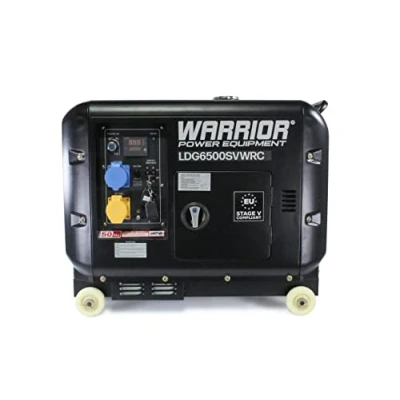 Advanced Performance: The new and improved Warrior model features increased power and a fully compliant EU5 standard engine with a brushed copper alternator, ensuring steady motor speed for reliable performance at 5500 maximum watts and 5000 running watts for high power Enhanced Convenience: Equipped with a range of features including Automatic Voltage Regulator (AVR) for smooth output monitoring, Wireless Remote Start, and 3-in-1 Intelli Voltmeter for easy operation and control. Quiet and Durable: Enclosed in a soundproof canopy with chip-resistant matt finish, the generator's heavy-duty industrial frame provides full protection. Anti-vibration mountings ensure smooth operation, while the key start facility adds convenience. Long-Lasting Run Time: With a fully fuelled 16-litre tank, this Warrior generator can run for up to 12 hours at 50% load, perfect for a variety of applications including domestic, construction, catering, and industrial use. Ultimate Portability: Featuring wheels for easy transport and a remote start function, this Warrior generator is designed for maximum convenience whether you're on-site or at home. Fitted with a 12v battery charging outlet and 240v and 110v single-phase output sockets for added versatility., Manufacturer: Warrior