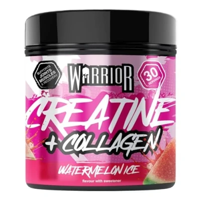 CREATINE + COLLAGEN FOR TOTAL PERFORMANCE – Harness the combined power of Warrior Creatine Collagen Powder to build lean muscle, boost performance and enhance strength. Creatine fuels training intensity, while collagen supports joints and mobility for lasting resilience. Made with no fillers, sugar or unnecessary ingredients. Produced in a GMP-certified UK facility with halal and kosher certification for complete purity. Vegan and easy to mix — not creatine gummies, tablets, capsules or pills. HYDROLYSED COLLAGEN FOR STRENGTH & MOBILITY – Each serving provides 5 g of premium Hydrolysed Collagen Peptides (Bovine, Types 1 & 3) to support joint health, connective tissue and bone strength for smoother movement and resilience during training. Warrior Creatine + Collagen supplements for women work together to maintain muscle performance while promoting healthy skin, hair and nails for a revitalised, active look and feel. CREATINE FOR STRENGTH & PERFORMANCE – Each serving provides 3 g of premium micronised creatine monohydrate to power your workouts, enhance endurance and support real strength gains. Train harder, lift heavier and tone legs and glutes with consistent results. Working in synergy with collagen for joints, it promotes resilience and all-round body performance — ideal for athletes and active individuals striving for continuous progress. PRE & POST-WORKOUT RECOVERY POWER – Refuel, repair and stay ready with the combined strength of our creatine and collagen powder. Creatine enhances training output and post-workout recovery by restoring muscle energy and reducing fatigue, while collagen supports ligaments, joints and connective tissue for smoother, stronger performance. A trusted creatine supplement used pre workout and post-workout by athletes, lifters and trainers to stay energised, mobile and consistent. SMOOTH-MIXING & EASY ON THE STOMACH – Ultra-fine micronized creatine powder dissolves quickly with no grit, clumps or chalky aftertaste, making it effortless to add to your routine. Mix with water, juice or your post-workout shake — ideal to stack with protein supplements. A clean alternative to creatine hydrochloride (HCL) formats, offering micronised monohydrate with bovine collagen. Available as unflavoured or flavoured creatine monohydrate powder for simple daily use.