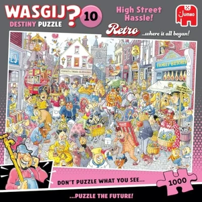 UNIQUE JIGSAW PUZZLE CONCEPT: Engage in a fun brainteaser with the perfect addition to your jigsaw puzzle collection, Wasgij Retro Destiny 10. Don't puzzle what you see, but instead puzzle the future. HAVOC ON THE HIGH STREET: On the bustling 1860s high street, hooves, barrow boys and chaos fill the streets, but what will this look like in the future? Use the clues to picture it and solve the puzzle! CHALLENGING AND FUN: Wasgij tests your imagination and problem solving skills to make you think outside the box. The perfect gift for puzzle enthusiasts who want to take puzzling to the next level. PUZZLE WITH THE PLANET IN MIND: The 1000pc jigsaw puzzle is made from sustainable and durable 100% recycled board. The precision die-cutting ensures every jigsaw piece maintains its original shape. THE WONDER OF WASGIJ: Take on the challenge of Wasgij. Instead of following the image shown on the box, you must use your imagination and clues provided to work out the picture that you are puzzling., Manufacturer: Jumbo Group