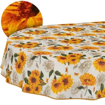 Sunflower splendour: bring home the warmth of summer with this sunflower tablecloth. With this bright motif, the washable tablecloth spreads a good mood anywhere, indoors and outdoors perfect for country house style. All-round textile feeling: with 50% cotton and 50% polyester, the sunflower tablecloth impresses with its soft drape, a look and pleasant feel like fabric. Elegant look with full care benefits, also ideal as an outdoor tablecloth. DURABLE & DURABLE: High quality materials & meticulous workmanship make the sunflower design washable tablecloth as beautiful as new for many years. The ideal country house style tablecloth for summer days. VERSATILE SIZES Whether it's round, oval, rectangular, this sunflower water resistant tablecloth comes in different shapes and sizes, just fit your table. Now with matching piping edging.