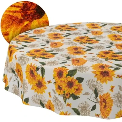 Sunflower splendour: bring home the warmth of summer with this sunflower tablecloth. With this bright motif, the washable tablecloth spreads a good mood anywhere, indoors and outdoors perfect for country house style. All-round textile feeling: with 50% cotton and 50% polyester, the sunflower tablecloth impresses with its soft drape, a look and pleasant feel like fabric. Elegant look with full care benefits, also ideal as an outdoor tablecloth. DURABLE & DURABLE: High quality materials & meticulous workmanship make the sunflower design washable tablecloth as beautiful as new for many years. The ideal country house style tablecloth for summer days. VERSATILE SIZES Whether it's round, oval, rectangular, this sunflower water resistant tablecloth comes in different shapes and sizes, just fit your table. Now optional with matching piping edging.