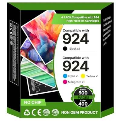 Washope 924 Ink Cartridges Compatible with HP 924 ink cartridges (Not Original) 924e Ink Cartridges Excellent print quality,meet your work requirements and deliver clear text and colourful images for your, saving you time. Compatible Printer With HP OfficeJet Pro 8120e OfficeJet Pro 8122e 8124e 8125e 8132e 8134e 8135e 8130e 8138e 8139e, for HP OfficeJet Pro 8120 8123 8130 8133 All-in-One Printer Washope 924 Ink Cartridges Page Yield:700 pages per 924 black and color ink cartridge (A4 at 5% coverage) Package Contents: 1 x 924 black ink cartridges , 1 x 924 cyan ink , 1 x 924 yellow ink , 1 x 924 magenta ink and 1 x CHIP REMOVE TOOL (924 ink cartridge has no chip, please use the tool to get the OEM chip and install it into the new cartridge) (Packaging version may vary) Our 924 Ink Cartridge Replacement for HP 924 Ink Cartridges 924e Ink undergoes rigorous testing before shipping to ensure you outstanding print quality and reliable performance; Dedicated technical support is available to you at any time.