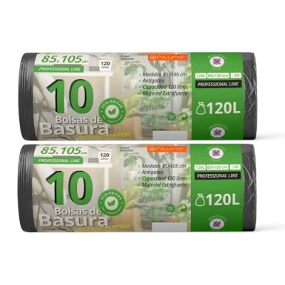 Roll Trash Bags: Measuring 85 x 105 cm, our 100% recycled material large size trash bags are tear resistant, ideal for medium 120L buckets, bags made with reinforced material, perfect for all types of waste. 120L Trash Can - These trash bags are suitable for a 120L trash can. Its anti-drip system allows you to throw wet waste, preventing spills and stains. ANYWHERE BAGS - Our large 120 litre bags can be used for general household trash and garden, garage or community waste. Our trash bags are suitable for large waste bins of approximately 120 litres in residential, commercial areas, public spaces, industrial facilities, hotels...etc. Adaptable Trash Bags: These trash bags are ideal for your 120L kitchen bin, garden, premises, commerce or anywhere. Fits perfectly in your trash can. Commitment to the environment: product made with recycled and recyclable plastic. Our recycled material bags join the contribution of the environment. Now you can choose a more sustainable product.