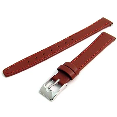 Ladies XL Replacement Burgundy Leather Watch Strap in Smooth Grain Stitched Leather 14mm wide where it fixes to your watch Extra long women's length - approx 170mm when buckled on the last hole. Add the length of the watch to find the maximum wrist size Non-allergic buckle in Chrome (Silver colour) finish Supplied complete with spring bars/watch pins.