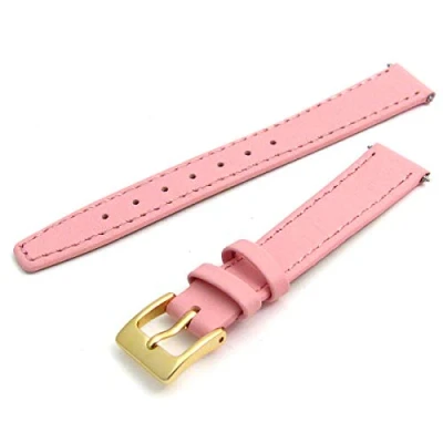 Ladies replacement watch strap in smooth grain leather with contrast stitching Colour: Pink with gold coloured buckle 10mm Wide where it fixes to your watch Regular women's length Supplied complete with spring bars