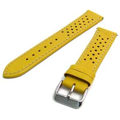 Men's Retro Racing Style Watch Strap in perforated, Breathable Leather. Yellow Leather with Non-allergic chrome finish buckle Measures 24mm wide where it fixes to your watch Regular men's length - please see the size diagram in the pictures for detailed dimensions Spring bars/watch pins included at no extra cost