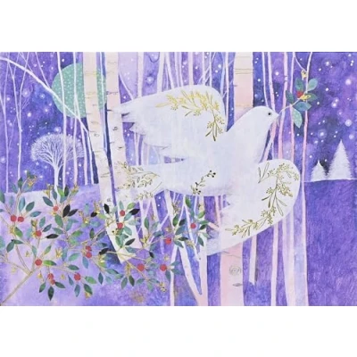 A snowy night, a winter forest, and a dove of peace aloft, bearing a sprig of holly. Send serenity with these beautiful greeting cards, painted in hues of indigo and violet. Premium card set includes 20 cards, 21 envelopes, and a matching keepsake box. The cards are larger than usual, providing ample space for personal messages. Smooth-finish card interiors are uncoated for writing ease. Quality card stock takes pen beautifully Card design is embellished with hand-selected touches of gold foil. Inside greeting: May the beauty of nature fill your heart with peace and joy throughout the year.