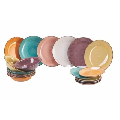 Watercolor Hut Table Set 18 Pieces in Hand Painted Stoneware, 6 Different Seats
