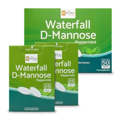 Waterfall D-Mannose Mints taste like regular breath mints and are a new easy way to consume D-Mannose. They can be sucked, chewed or swallowed. Organic Peppermint Extract expertly blended with birch D-Mannose. D-Mannose is an ingredient mentioned on the NHS website as an alternative way to prevent UTIs from coming back. D-Mannose can be used daily at lower doses for prevention or higher amounts for immediate support. Waterfall D-Mannose Mints' new dispensers contain 25 mints per dispenser and can be carried discreetly in a handbag or pocket. Our new cardboard dispensers are free from plastic and a much better alternative to plastic. Suitable for Men & Women, Waterfall D-Mannose Mints are a fantastic option when on the go or for anyone who doesn't like swallowing tablets. Suitable for Vegans & Vegetarians. Free from all 14 FSA food allergens & ideal for all diets. No food colourings or artificial flavourings. Free from Silica and Sodium. NON-GMO. Expertly blends D-mannose sourced from birch. Our D-mannose is extracted naturally from birch without the use of solvents or chemicals. Our D-Mannose Mints / Tablets are free from bulking agents and fillers - such as sodium & silicon dioxide.