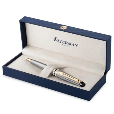 BrepenShowcase signature Parisian style and enrich your working day with the Waterman Expert fountain pen. Refined, brushed stainless steel body, stunning 23-carat gold trim and clip, and a wide branded ring that reveal the fine craftsmanship that lurks a creative spirit beneath your leading character. Each luxury Waterman pen is manufactured in France and presented in a premium Waterman gift box.