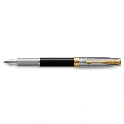 The Parker Sonnet Metal & Black is the classic version of sophisticated style and elegance. This has a black opaque lacquer with glossy varnished, gold-plated finished details and an 18k solid gold nib covered with a rhodium finish. The etched cap has a detailed diamond pattern that ensures sophistication at every writing opportunity.
