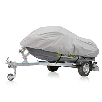 139’’ - 145’’ INCH FIT: The jetski trailer cover has a universal form-fitting size to ensure a secure, long-lasting fit. It is made of 100% polyester so you can be sure that your boat is safe and fully protected from harsh weather conditions MADE OF HEAVY DUTY FABRIC: Keep your jetski protected from the rain with the help of this strong and durable boat cover. The boat cover is made of waterproof & heavy duty fabric to keep your jet ski safe & protected PREVENTS MOISTURE BUILD-UP: This jetski cover is a great addition to your boat accessories. It has rear air vents to reduce inside condensation and wind lofting, keeping your personal watercraft in good condition at all times ELASTIC CORD FOR A CUSTOM TIGHT FIT: The heavy-duty jetski cover has an elastic cord to keep your personal watercraft safe and fully covered. It comes with an adjustable strap for secure long-term storage, mooring & highway transport COMES WITH AN ANTI-MOISTURE STORAGE BAG: It comes with a storage bag that will keep your boat cover protected from dust, moisture when not in use. It won’t shrink or stretch so you can make sure that the boat will last long