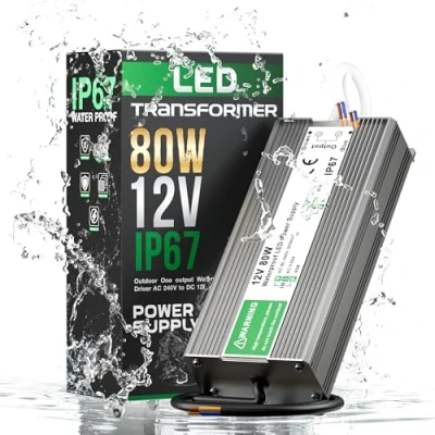 Waterproof LED Driver 12V IP67 Outdoor Power Supply,80V Transformer for Strip Lights, Garden Lamps, and Landscape Lighting Durable & Safe, Ideal Wet Environments Installations