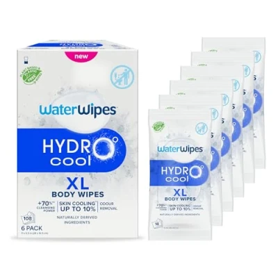 WaterWipes HydroCool Cooling Wipes, XL Body Cleaning Wipe, Stay Fresh & Cool On the Go Instant Skin Cooling, Odour Sweat Removal, Ideal for Gym, Travel Outdoor Use, 108 Count (6 Packs)