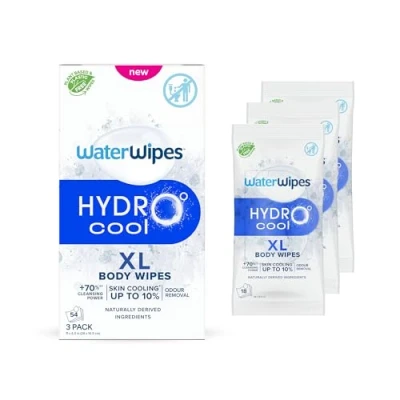 WaterWipes HydroCool Cooling Wipes, XL Body Cleaning Wipe, Stay Fresh & Cool On the Go Instant Skin Cooling, Odour Sweat Removal, Ideal for Gym, Travel Outdoor Use, 54 Count (3 Packs)