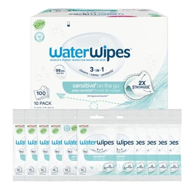MADE FOR OUT & ABOUT: Crafted to gently clean and protect skin, these Sensitive+ On-The-Go unscented wipes have just two ingredients - 99.9% purified water and a drop of fruit extract. EVERYDAY USE ON SENSITIVE SKIN: When life plays dirty, WaterWipes plays it clean. Ideal for cleaning small messes and refreshing skin on-the-go, these disposable wipes make the perfect daily essential. 3-IN-1 SKIN CARE BENEFITS: Made using minimal ingredients, our wipes have a neutral pH range, which helps protect the skin. This makes them ideal for cleaning small messes, refreshing skin and travelling. 2X STRONGER: Upgraded for more versatility, WaterWipes are now thicker, softer & 2x stronger to tackle tougher messes while keeping the same, trusted purity. PURE & GENTLE FORMULA: WaterWipes unique 7 stage water purification, requires minimum ingredients, with 0% fragrance and alcohol. PLASTIC-FREE*, PLANT BASED WIPES: Suitable for eczema-prone skin, WaterWipes are Dermatologically Approved by the Skin Health Alliance and registered by the Vegan Society. DERMATOLOGIST TESTED FOR SENSITIVE SKIN: WaterWipes baby wipes are dermatologist tested and suitable for delicate and eczema-prone skin. Their gentle formula helps cleanse effectively while caring for skin that needs extra softness. EVERYDAY CARE WITH GENTLE INGREDIENTS: Made with 99.9% purified water and a drop of fruit extract, WaterWipes baby wipes are ideal for daily messes. Their neutral pH makes them ideal for refreshing sensitive skin. *Claim does not refer to the full product lifecycle nor packaging. Wipes made from regenerated cellulose.