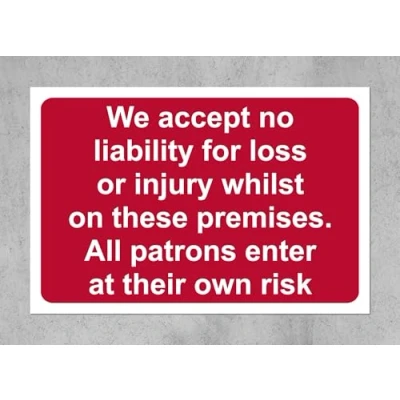 We accept no liability for loss or injury whilst on these premises safety sign 1mm Plastic sign Digitally printed and laminated for extra durability Drill and screw in position or use double sided tape to mount onto suitable surface