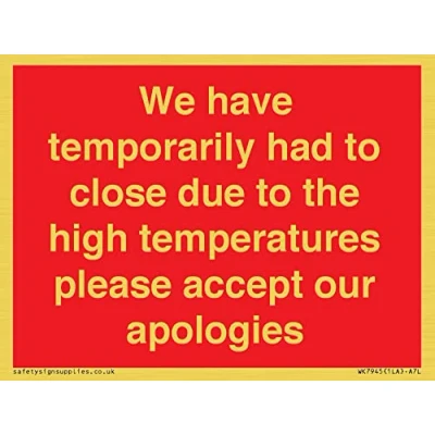 NO SYMBOL This sign consists of a gold colored vinyl decal Decal features a gold metal effect sticker for flat clean surfaces. Not for rough, plastic or dusty surfaces. A7 landscape Sign text: We have had to temporarily close due to high temperatures, please excuse our apologies.