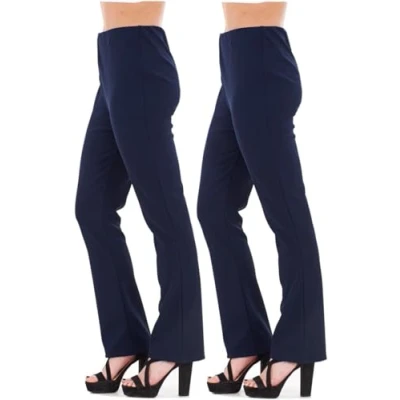 WearAll Pack of 2 Bootleg Trousers Women Boot Cut High Rise Stretch Soft Finely Ribbed Pull On Nurse Carer Work Bottoms Navy Long 10