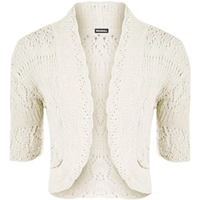WearAll Womens Crochet Knitted Short Sleeve Ladies Bolero Cardigan Top Shrug Cream 16 18
