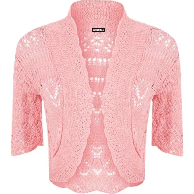 WearAll Womens Crochet Knitted Short Sleeve Ladies Bolero Cardigan Top Shrug Pink 14 16