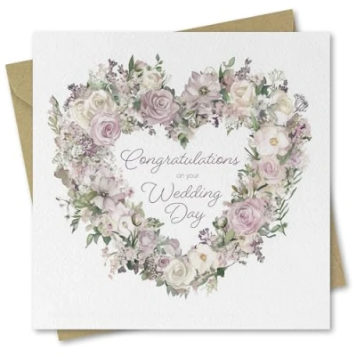 Wedding Card for bride and groom Congratulations on your Day. Floral Wreath Design. 150 x 150mm when folded. Supplied with envelope.
