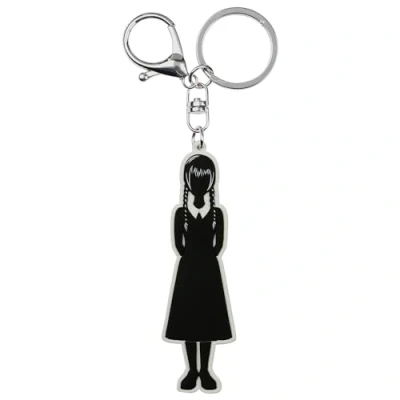 Soft PVC keychain Design features a silhouette of Wednesday Both front and back effect Metal ring and hook Dimensions: 0.5 x 2.7 x 9 cm