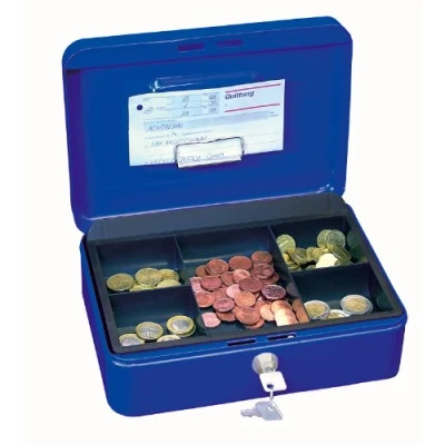 Made from heavy gauge welded steel Fitted with strong lock and supplied with 2 keys with key number engraved on keylock Metal clip on underside of lid holds bank notes, receipts etc Complete with removable plastic coin tray Carrying handle rests flat in recess in lid for easy stacking