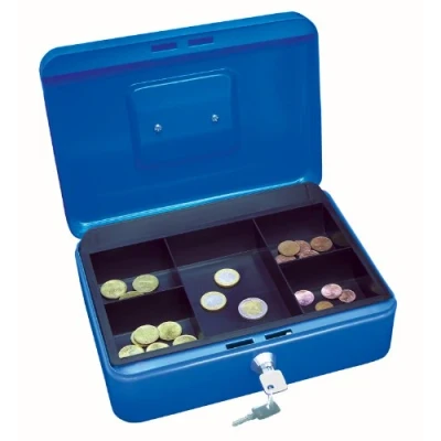 Made from heavy gauge welded steel Fitted with strong lock and supplied with 2 keys with Key Number engraved on keylock Complete with removable plastic coin tray Carrying handle rests flat in recess in lid for easy stacking