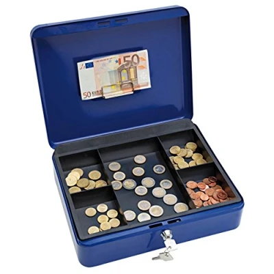 Made from heavy gauge welded steel Fitted with strong lock and supplied with 2 keys with Key Number engraved on keylock Metal clip on underside of lid holds bank notes, receipts etc Complete with removable plastic coin tray Carrying handle rests flat in recess in lid for easy stacking