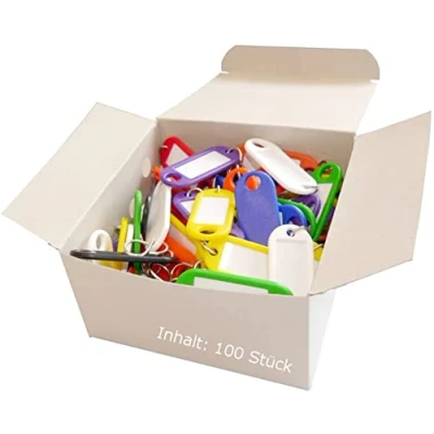 Storage pack with 100 key rings - made in Germany An S-hook is attached to all key plates Easily replaceable labels Perfect for clearly labeling your keys Pendant size: 5.2 x 2.1 x 0.3 cm