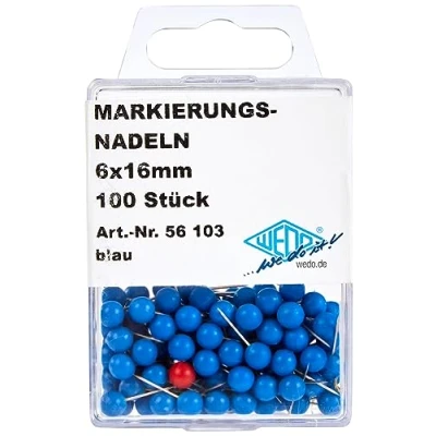 Wedo marking needle made from nickel plated flat iron wire, with Griffsicherem plastic head. Needle length: 16 mm Head Diameter: 6 mm Pack of 100 in a practical box Colour: Blue