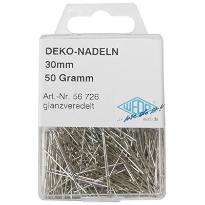 Wedo decouples made of metal, nickel-plated. Needle length: 30 mm. Contents: 50 g, packed in a practical tin. Colour: silver. Suitable not only for decorating, but also for attaching all kinds of things.