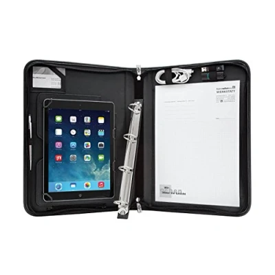 Features a removable tablet holder and folding presentation stand for horizontal and vertical formats Practical, multifunctional features including detachable 4 ring mechanism making it an ideal business companion Includes , A4 compartment for documents in front, zippered pocket in back and 3 accessory holders