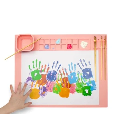 CONVENIENT DESIGN With 14 small color panels, a large mixing field, as well as a removable, foldable cup and 4 brush holders, this painting mat offers many functions for a short-time craft and painting activity The removable cup can be used either unfolded and folded The silicone mat is easy to clean, can be easily wiped clean with a cloth and warm soapy water Excellent for children and adults for painting with watercolour, watercolour or other colours as well as for crafts or crafts such as jewellery or watch repairs The craft mat from WEDO is made of flexible silicone and can therefore always be stowed away to save space