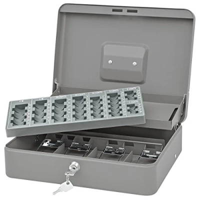 Made from robust, powder-coated sheet steel with a matte, hard-wearing surface and equipped with a carry handle and a cylinder security lock with 2 keys The 4-compartment insert for banknotes is equipped with metal holding brackets - behind the note compartments there is still storage space for coin rolls, receipts etc Dimensions: 30.0 x 24.0 x 9.0 cm, weight: approx. 2,240 g, colour: coin insert and cassette grey International products have separate terms, are sold from abroad and may differ from local products, including fit, age ratings, and language of product, labeling or instructions.