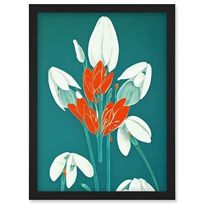 Wee Blue Coo Abstract Snowdrops Red Flowers on Teal Retro Mid Century Style Artwork Framed Wall Art Print A4