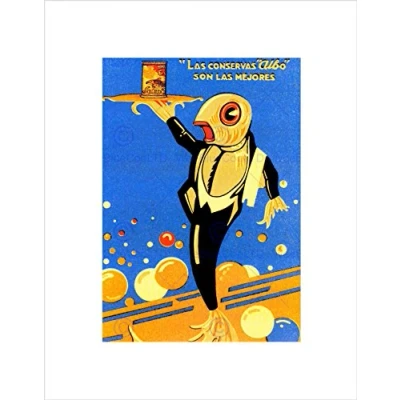 Wee Blue Coo Advert Food Fish Waiter Tray Tin Can Bubbles Spain Wall Art Print
