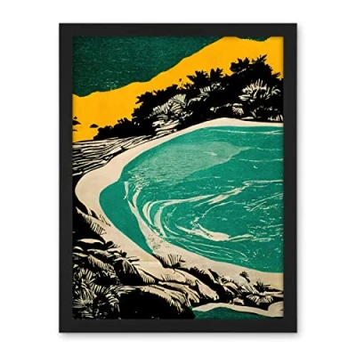 Wee Blue Coo Beach Lagoon Abstract Marbled Seascape Mustard Teal Artwork Framed Wall Art Print 18X24 Inch
