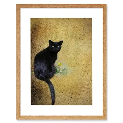 Wee Blue Coo Black Cat Yellow Flower Artwork Framed Wall Art Print 12X16 Inch