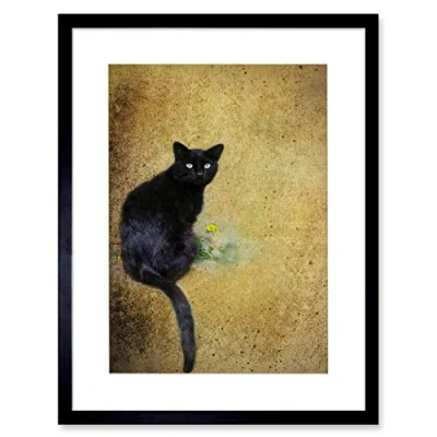Wee Blue Coo Black Cat Yellow Flower Artwork Framed Wall Art Print 12X16 Inch